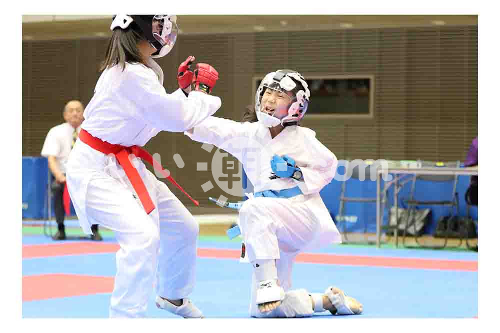 060010【埼玉県スポ少空手道交流大会】小学女子組手6年の部決勝で突きを決める新原凛子(志木向上会)